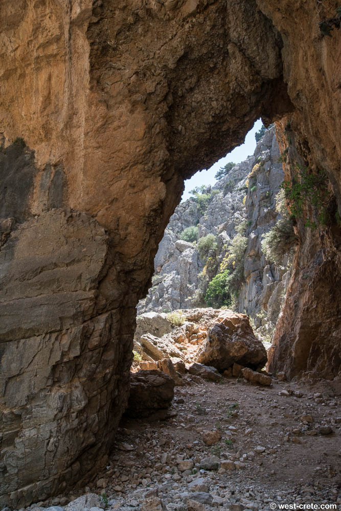 The gorge (Greek: Φαράγγι Ίμπρου, Faragi Imbrou) is an 11 km long canyon located near Hora Sfakion in southern Crete. It runs parallel to Samariá Gorge, its narrowest part is 1.60 m wide and it ends at the village of Kommitádes (8 km/ 650 m for hiking).