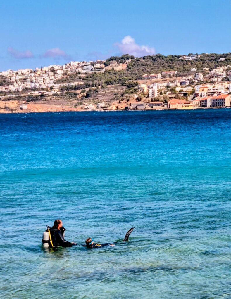 Then, with wetsuits, boots, fins and tanks selected, everyone headed to the 150-metre-away Koum Kapi beach under the supervision of an instructor.The weather was beautiful and sunny that day, with not too much wind, which guaranteed a smooth descent into the water and wonderful views.